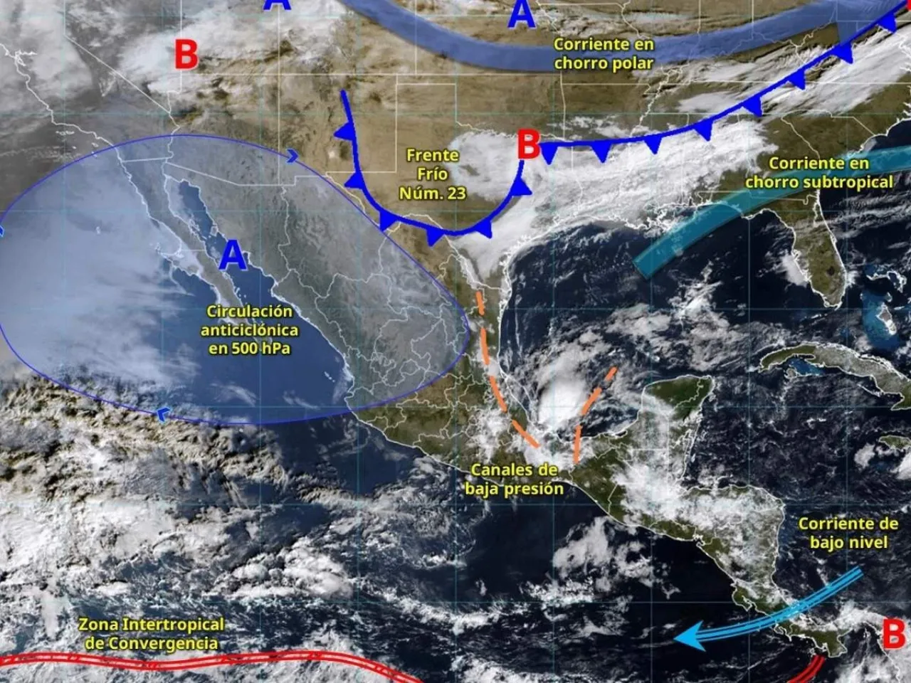 El frente número 23 podrá estabilizarse durante la mañana sobre el noreste de México y se disipará en el transcurso de la tarde, dejando de afectar a la República Mexicana. Un anticiclón en niveles medios de la atmósfera favorecerá condiciones de tiempo estable y sin lluvia sobre entidades del norte, noroeste y occidente del país. Al mismo tiempo, ocasionará un ascenso de las temperaturas vespertinas y un ambiente frío durante la noche y la madrugada sobre entidades de la Mesa del Norte y la Mesa Central por efecto de irradiación solar, gracias al cielo despejado.